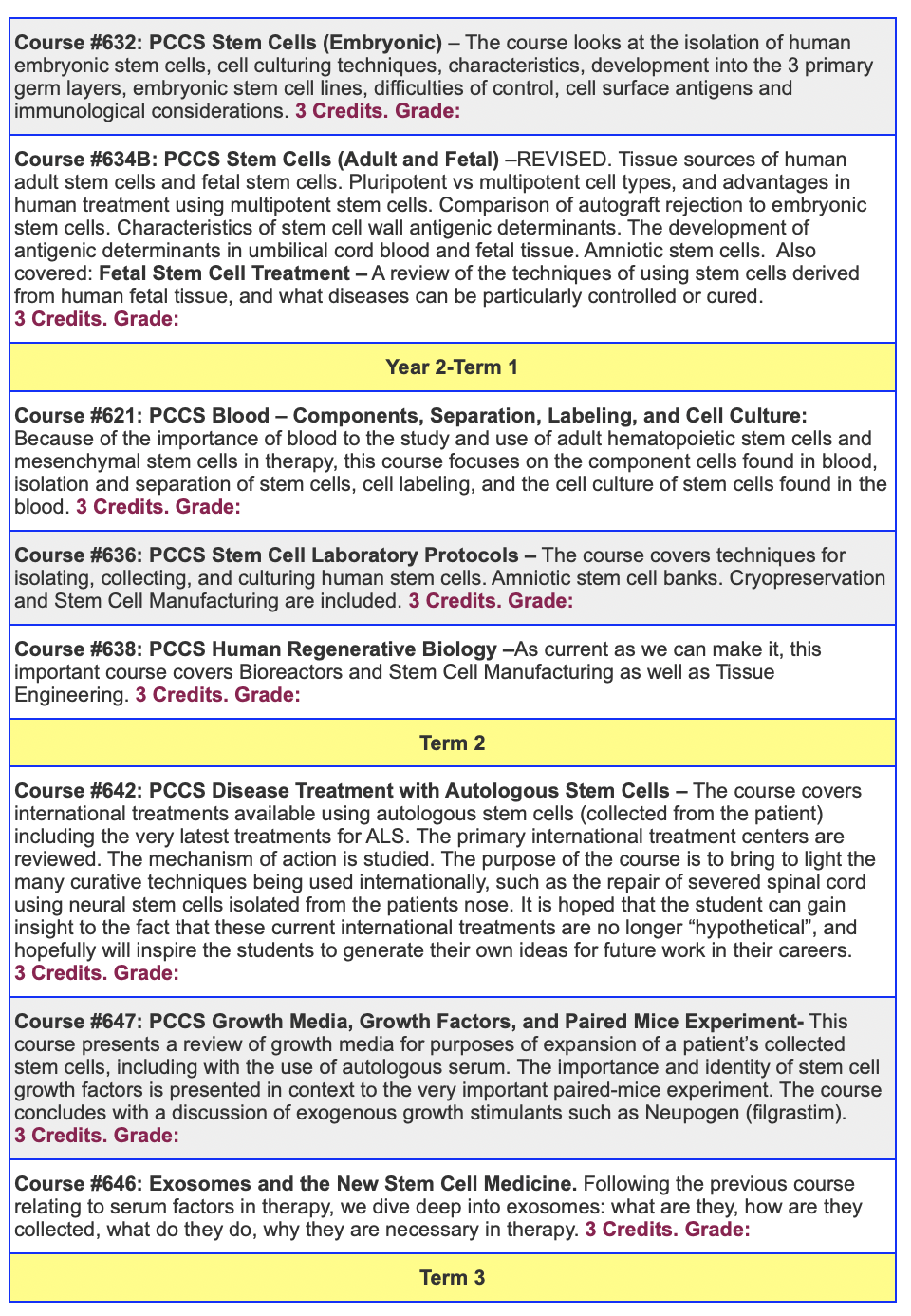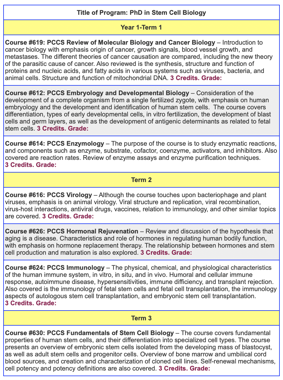 The program concludes with the completion of the Dissertation (Click on Dissertation section below Academics in above navigation bar). In addition, students are encouraged to seek out training sessions, and various stem cell lab projects which occur from time to time in their home countries. Such hands-on lab training is certainly beneficial, and if completed during the student’s study with the College, is added to the official academic record of the student. Lastly, although we have no laboratory, we do train students in laboratory procedures. Here is a Sample Assignment Concerning Growth Media of one of our students discussing the procedures and equipment for expanding adult stem cells ex vivo. We are confident that our graduates can be comfortable and capable of discussing stem cell issues in any environment.