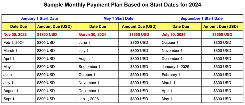 $3,750 USD per year with payment plan [$1350 USD down payment at enrollment, and 8 monthly payments of $300 USD thereafter]; or $3400 USD per year advance lump sum payment.